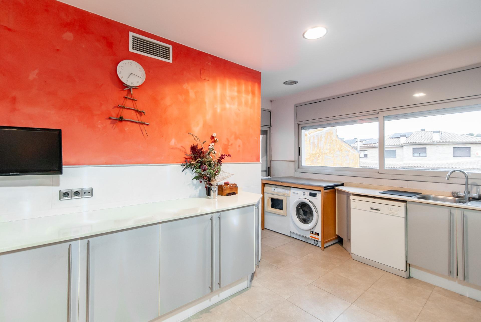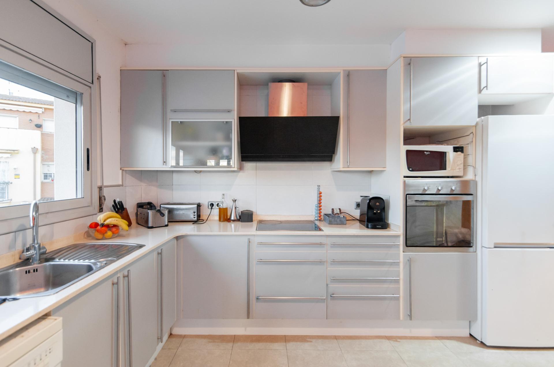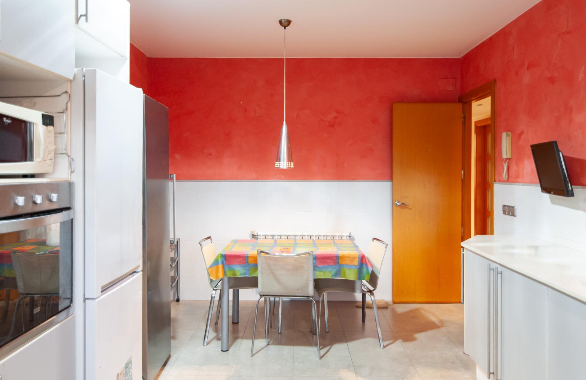 En la planta superior, a la que se accede mediante escalera interior, encontramos un segundo salón-comedor, amplio y muy luminoso gracias a los grandes ventanales que dan acceso a un balcón de generosas dimensiones. En esta planta también hay una cocina independiente, grande y totalmente equipada, con espacio para mesa de comedor y salida directa al balcón.