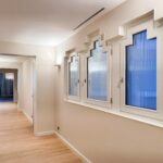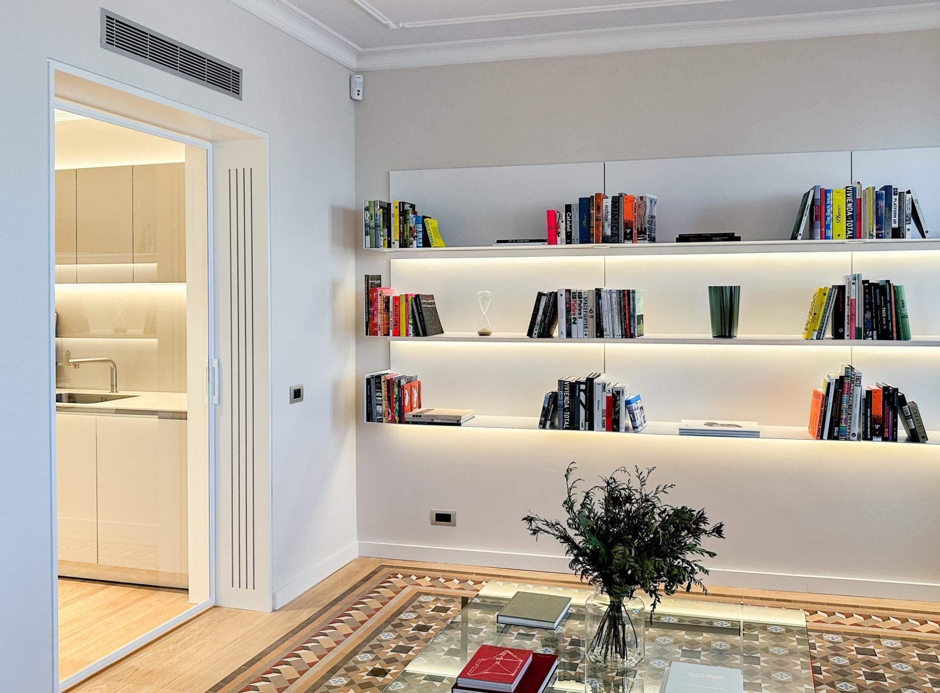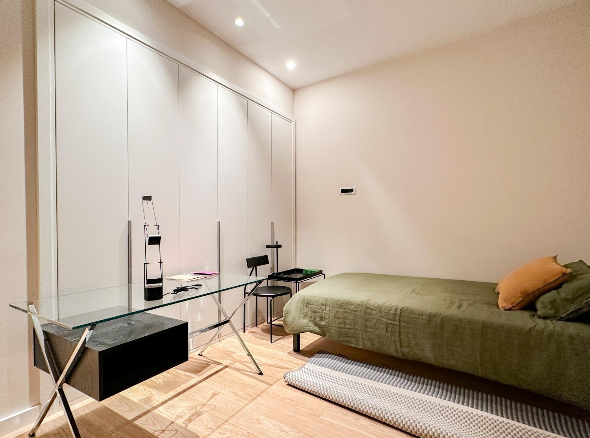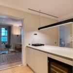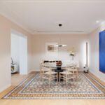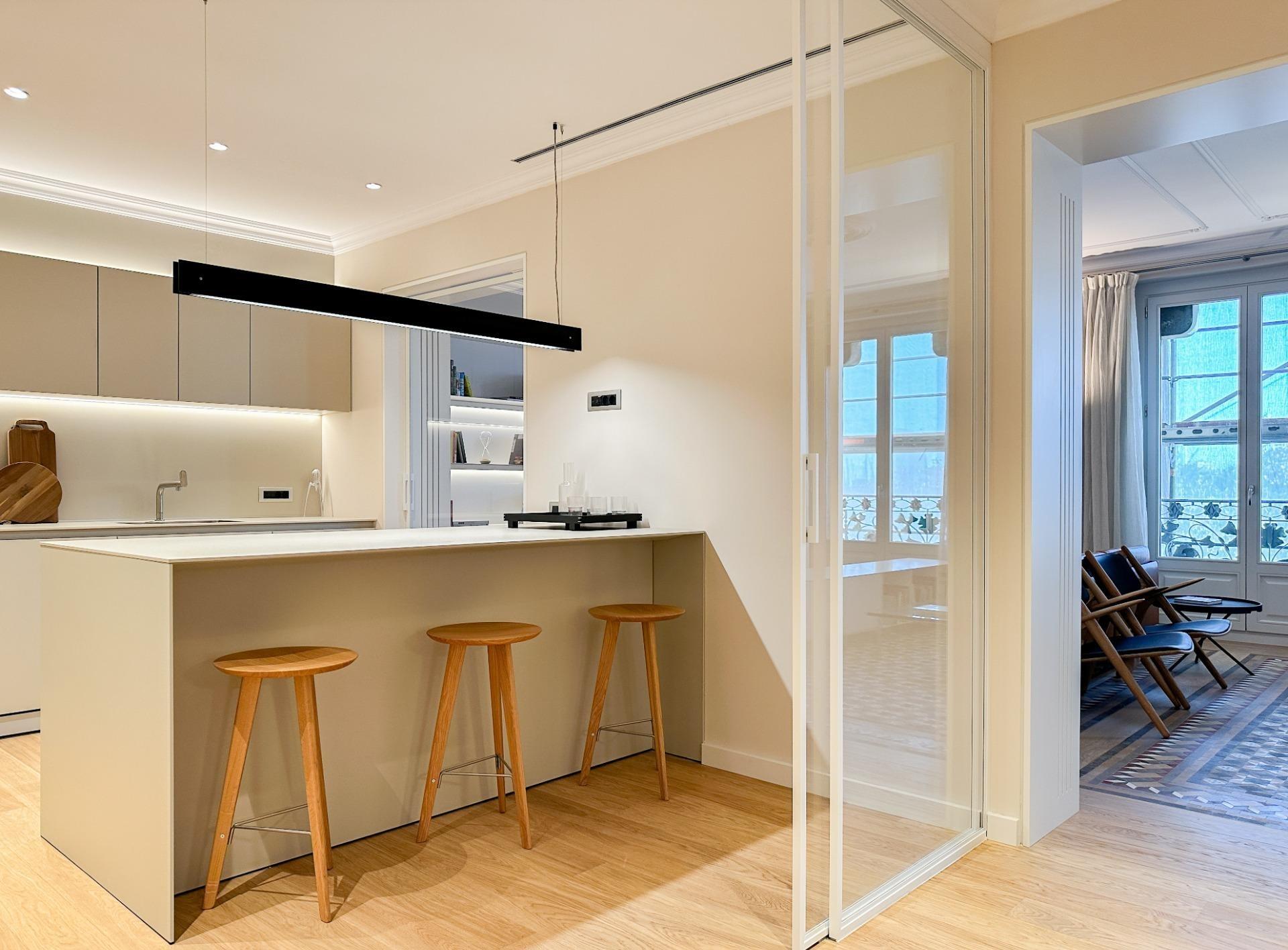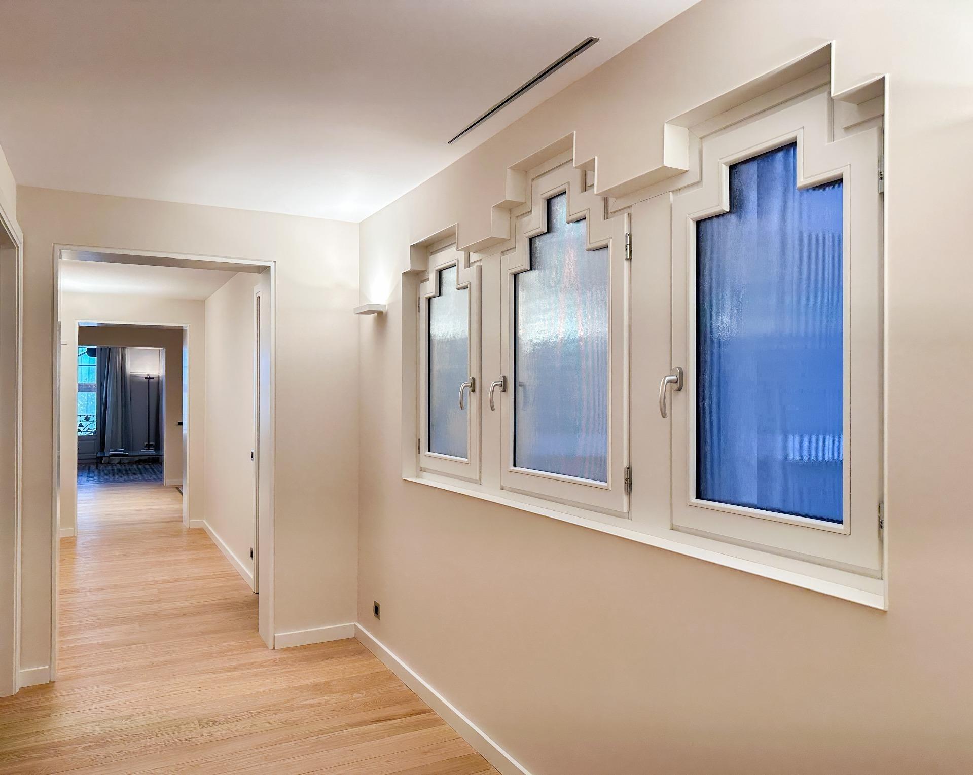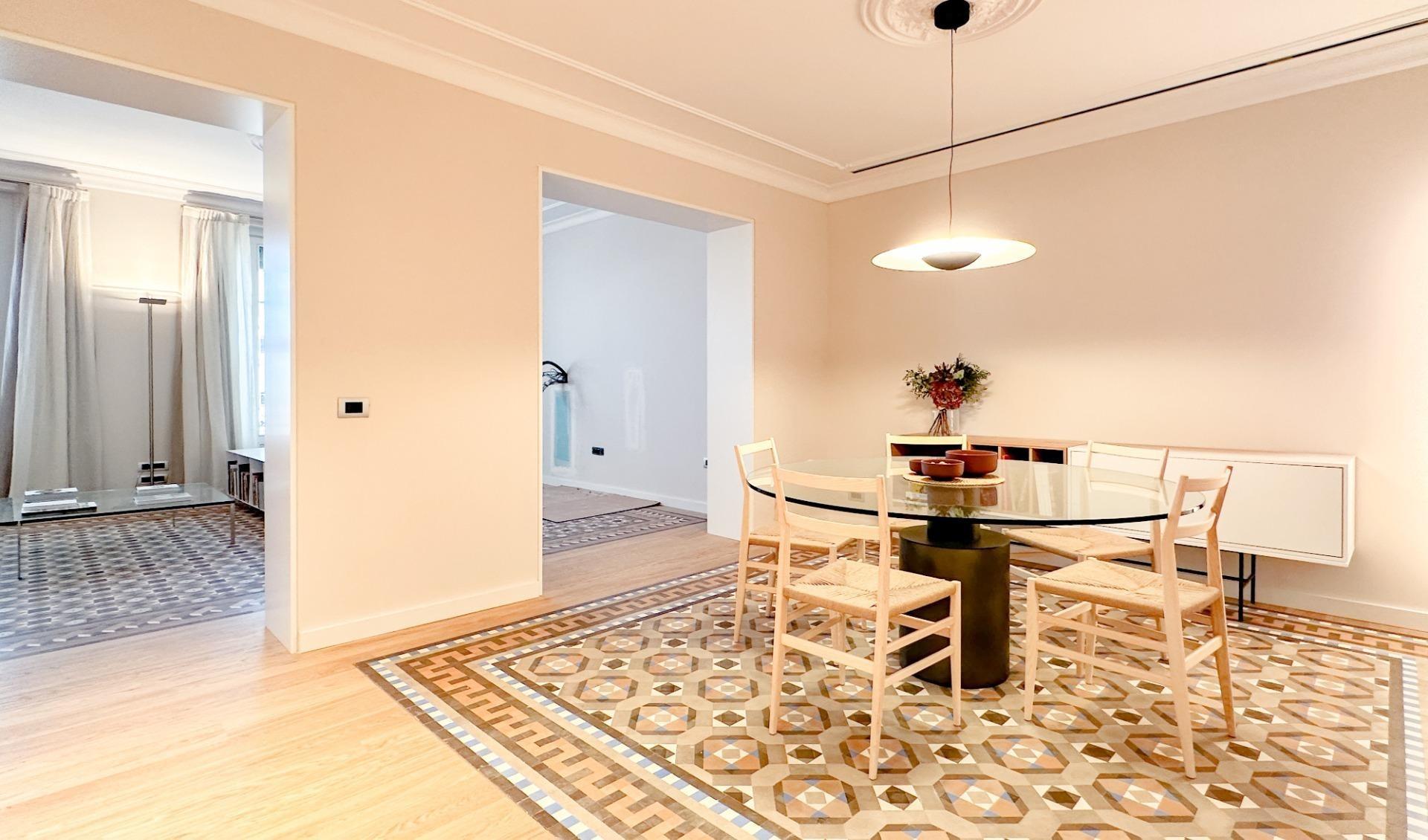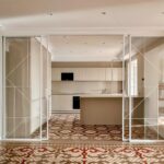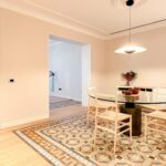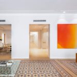 El proyecto pone en valor los elementos originales del edificio, como el suelo restaurado con esmero, que aporta carácter y autenticidad al conjunto. A ello se suma una cuidada selección de acabados de alta calidad: carpinterías exteriores con alto aislamiento térmico y acústico, griferías de diseño, climatización por conductos y un interiorismo elegante y atemporal.