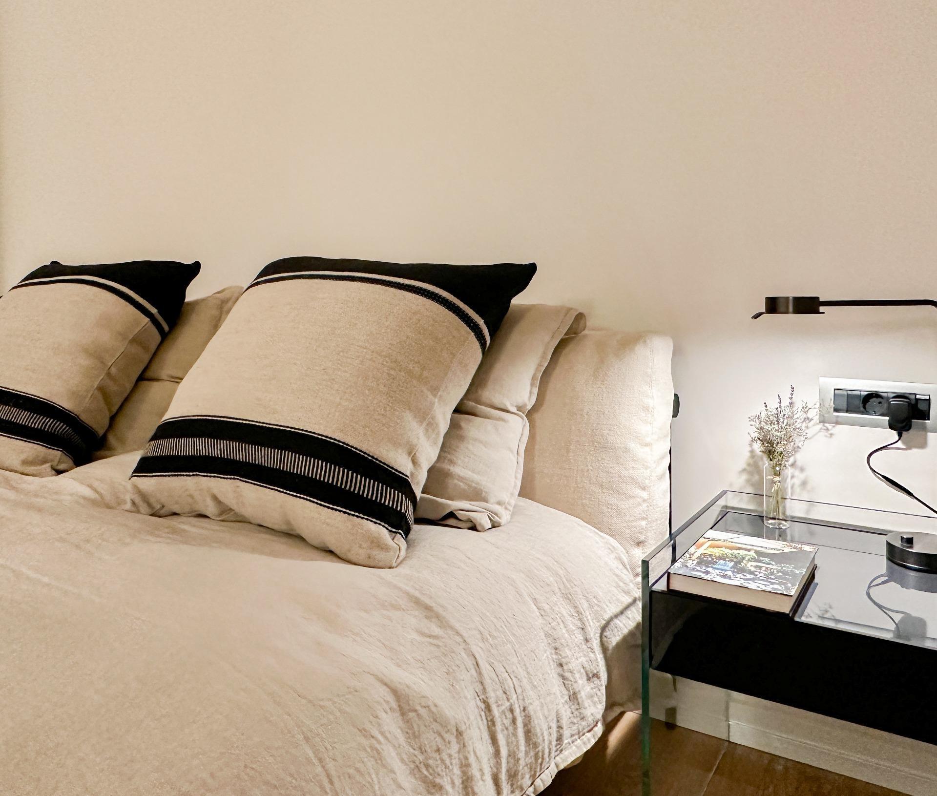El piso combina el carácter señorial de la finca regia original con la sofisticación de un interiorismo contemporáneo, materiales nobles y acabados premium. Cuenta con tres dormitorios, dos baños y cocina independiente, todo ello distribuido con elegancia para ofrecer amplitud, luz natural y confort.