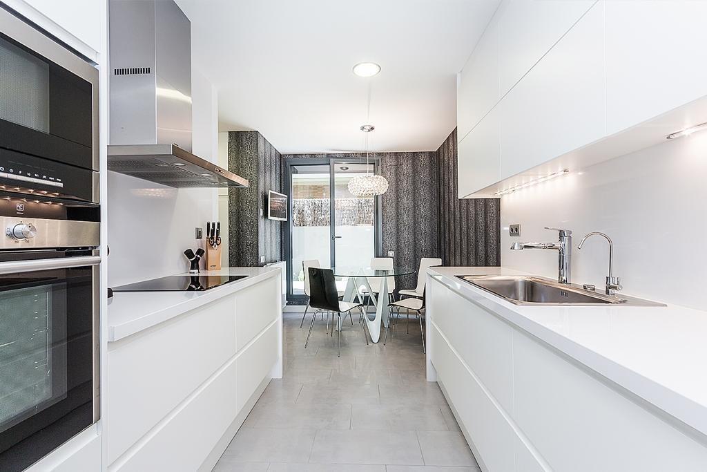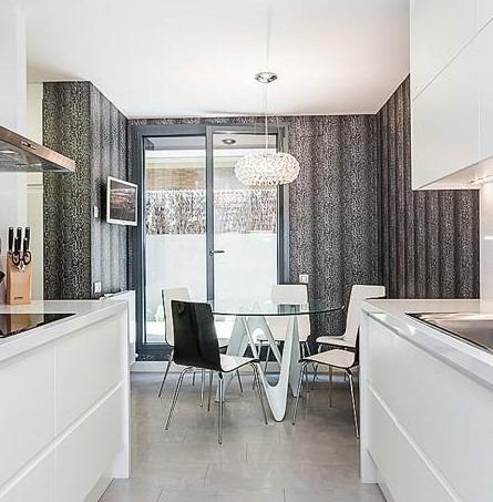 La cocina, de diseño tipo office, es un verdadero deleite gracias a su luminosidad y equipamiento con electrodomésticos de alta gama, incluyendo lavavajillas, horno y nevera. Se complementa con un práctico lavadero, que cuenta con lavadora, secadora y zona de planchado.