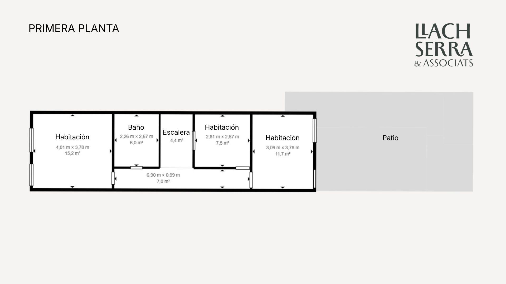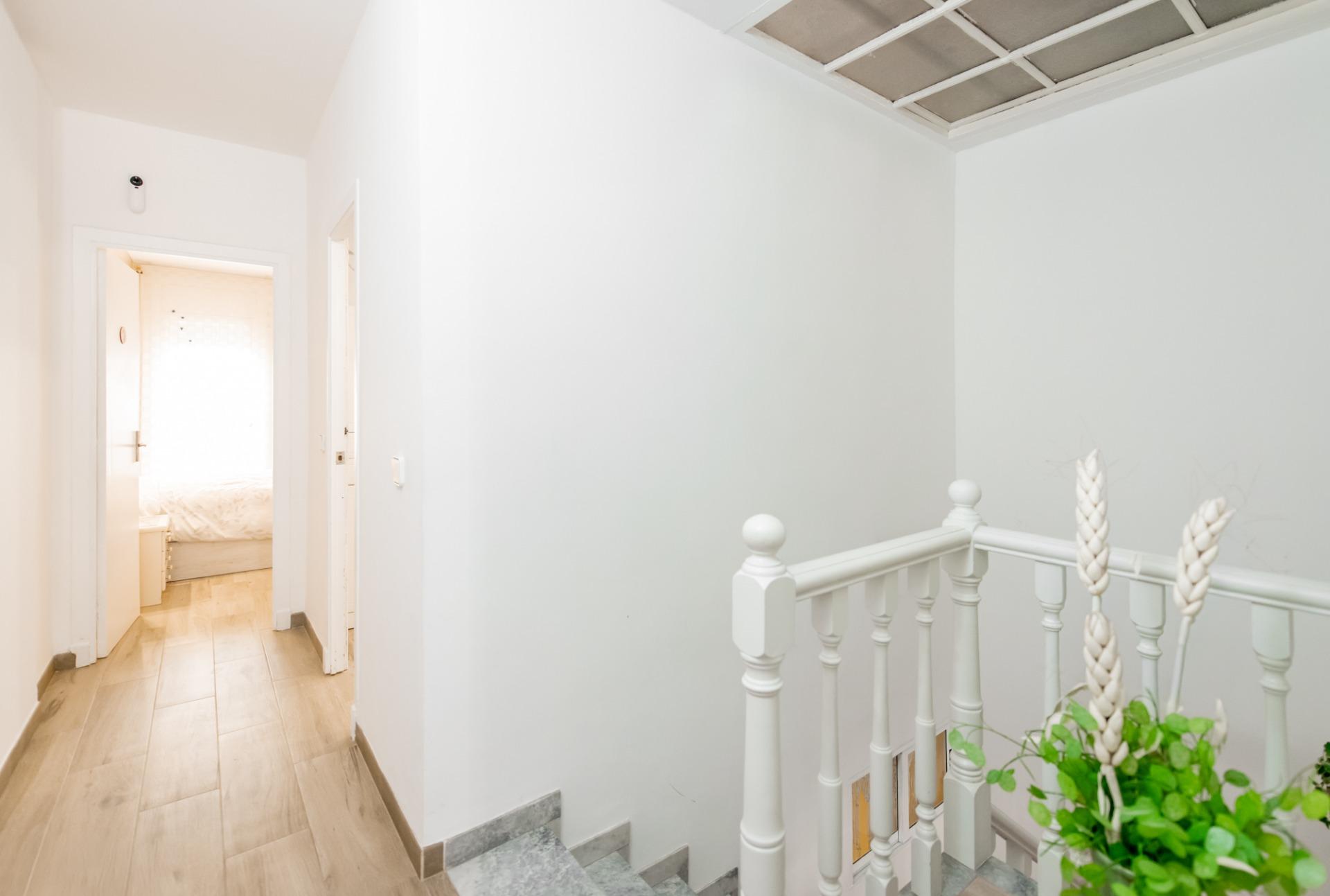 A la planta superior s’hi ubica la zona de nit, amb dues habitacions dobles, ambdues amb finestra, una d’elles amb accés directe al pati superior. A més, trobem un bany complet amb dutxa de grans dimensions i una tercera habitació individual, interior, amb finestra orientada a l’escala de l’habitatge.