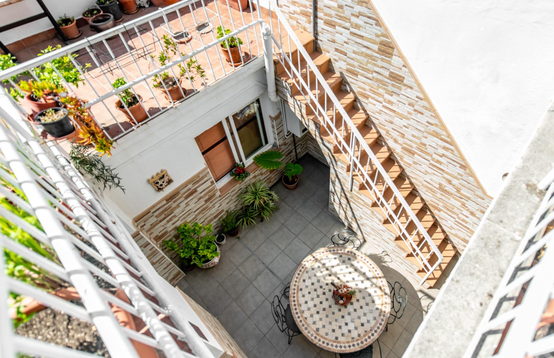 Des del saló-menjador i la cuina s’accedeix al pati exterior, un espai molt aprofitable que connecta ambdues plantes mitjançant unes escales exteriors, generant una relació fluida entre interior i exterior.