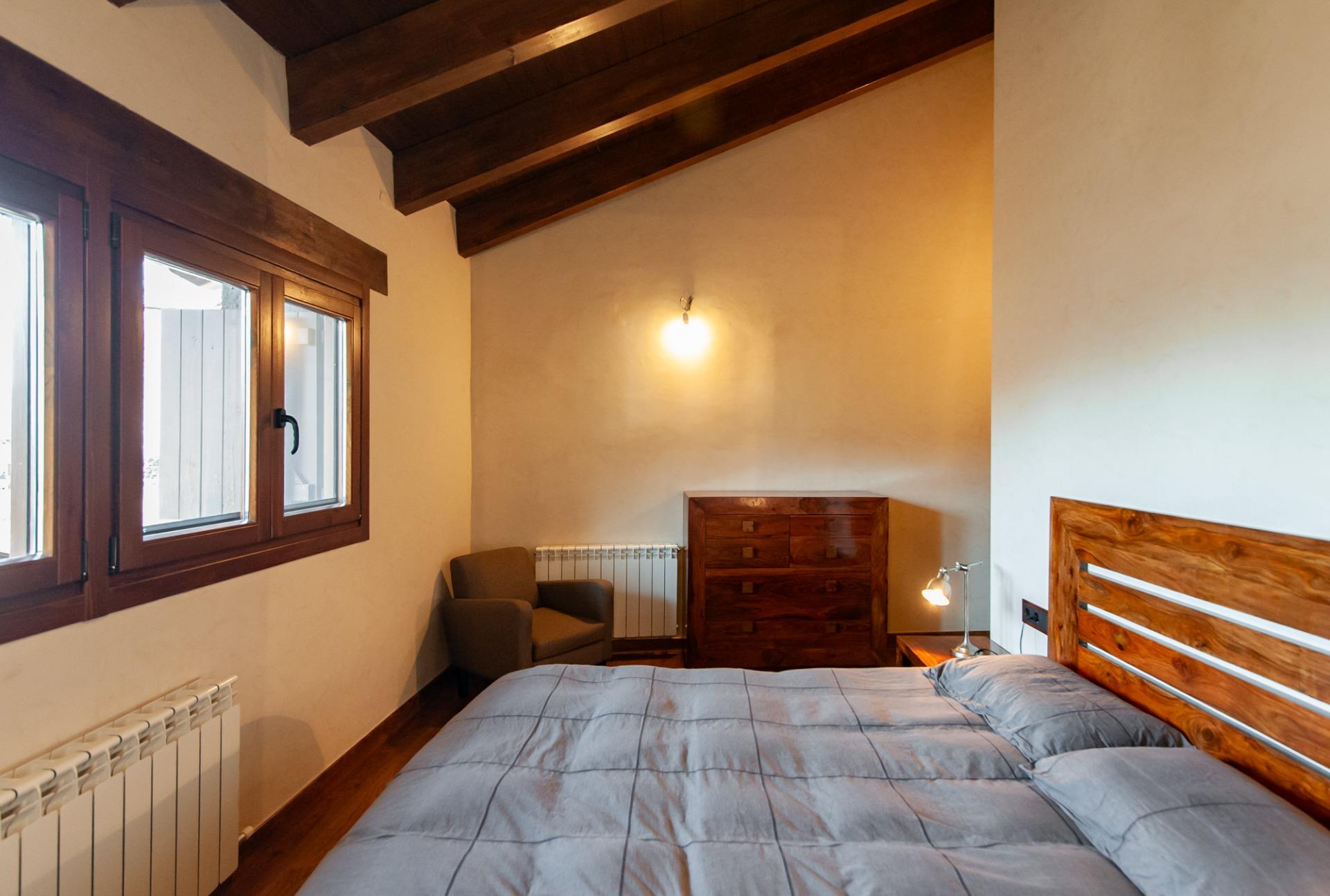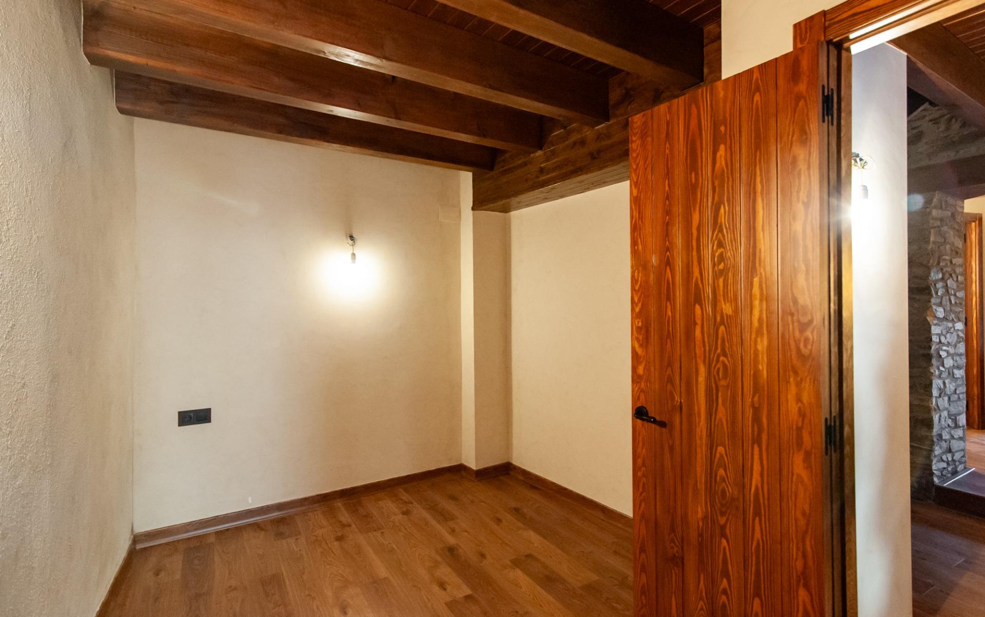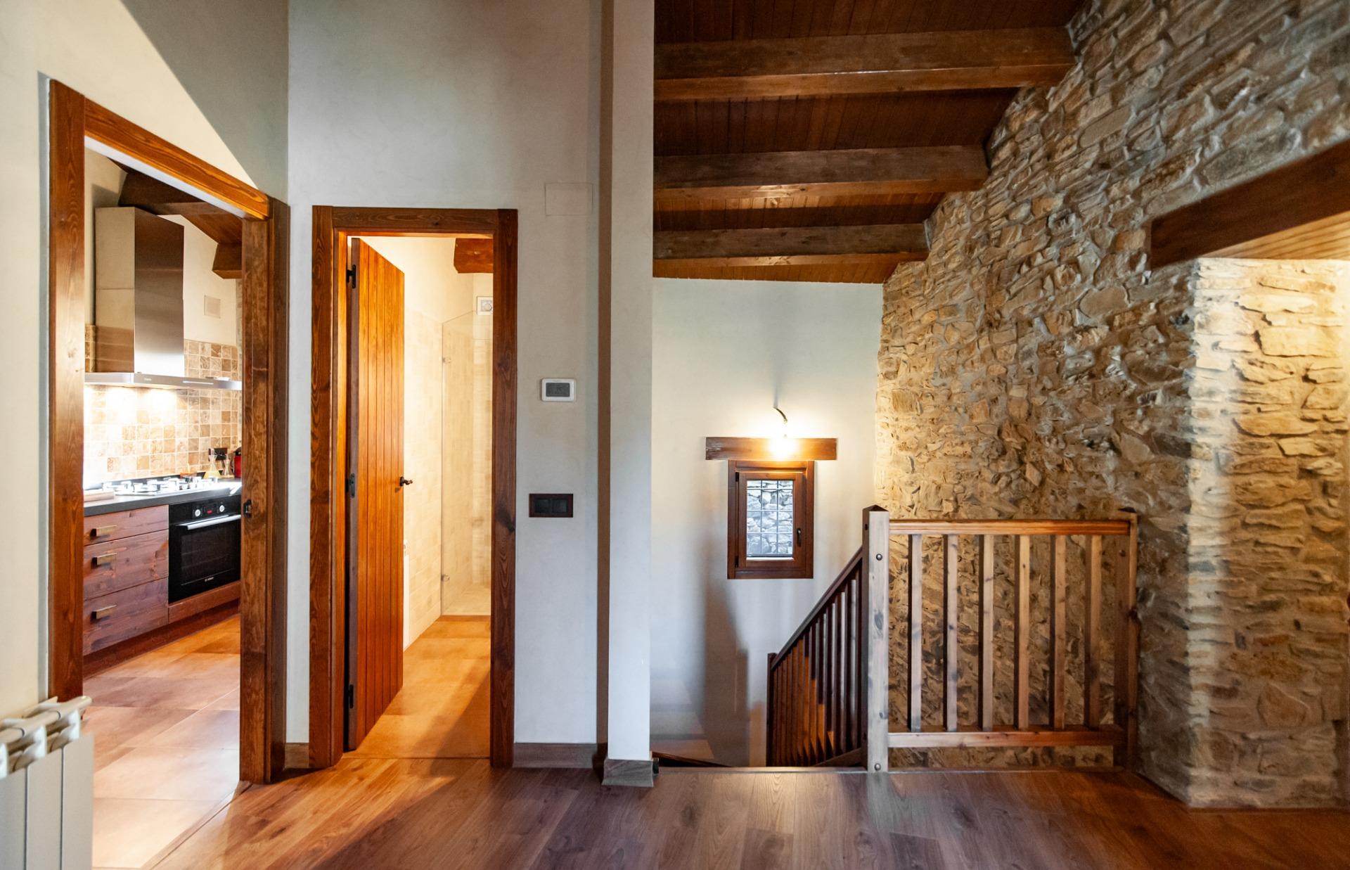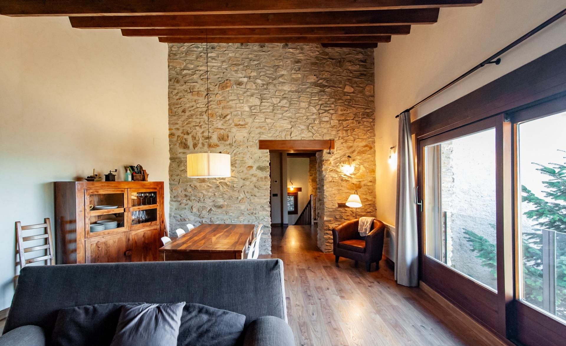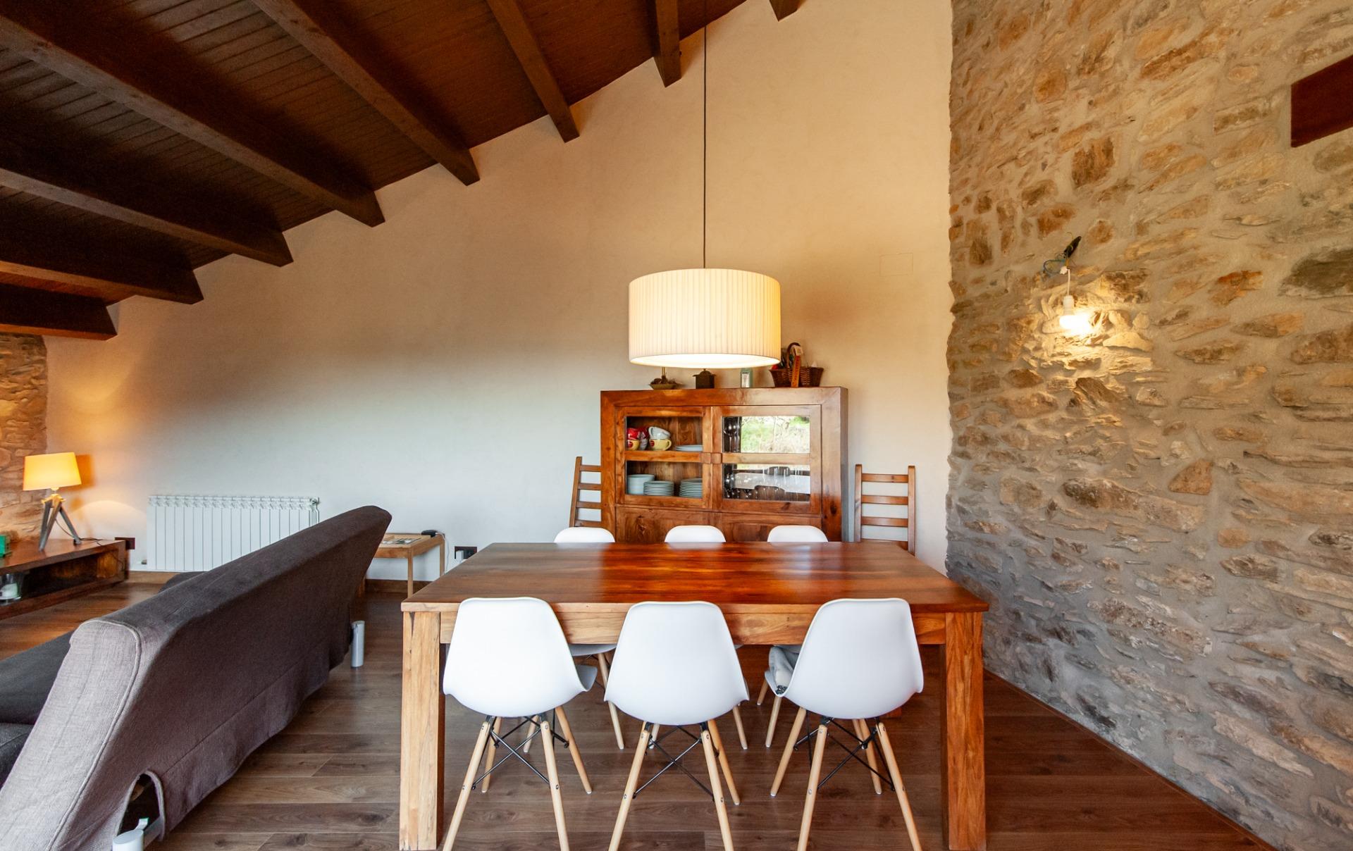A través d’unes boniques escales de fusta accedim a la primera planta, on es troba el nucli principal de l’habitatge. Aquí destaca un preciós saló-menjador amb sostre de bigues de fusta, un espai molt càlid i lluminós gràcies al gran finestral amb vistes obertes a la muntanya. El saló disposa també de llar de foc, reforçant el caràcter acollidor de la casa.