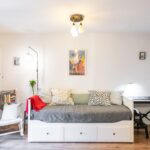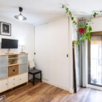 El pis s’organitza en un espai diàfan que integra la zona de cuina, sala d’estar i dormitori, creant un ambient còmode i ben aprofitat. Des d’aquesta estança s’accedeix a un petit balcó, que aporta llum natural i ventilació. L’habitatge es completa amb un bany amb dutxa en bon estat.