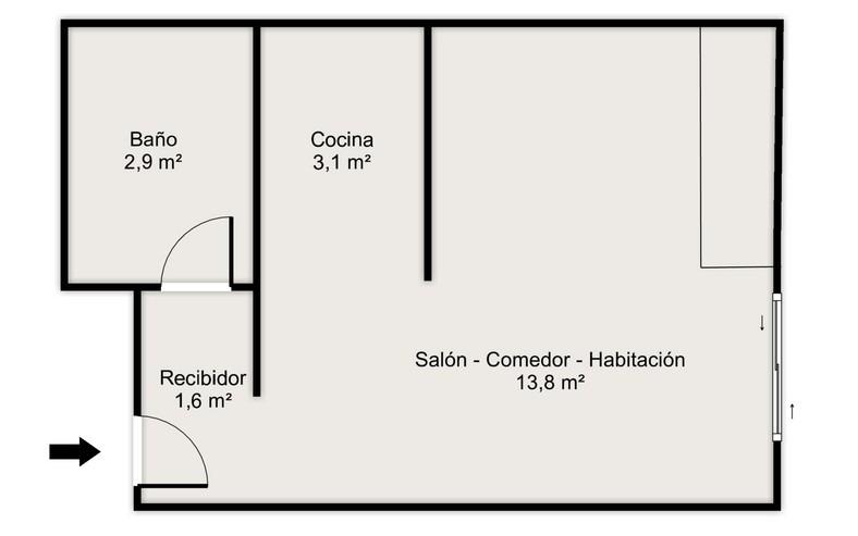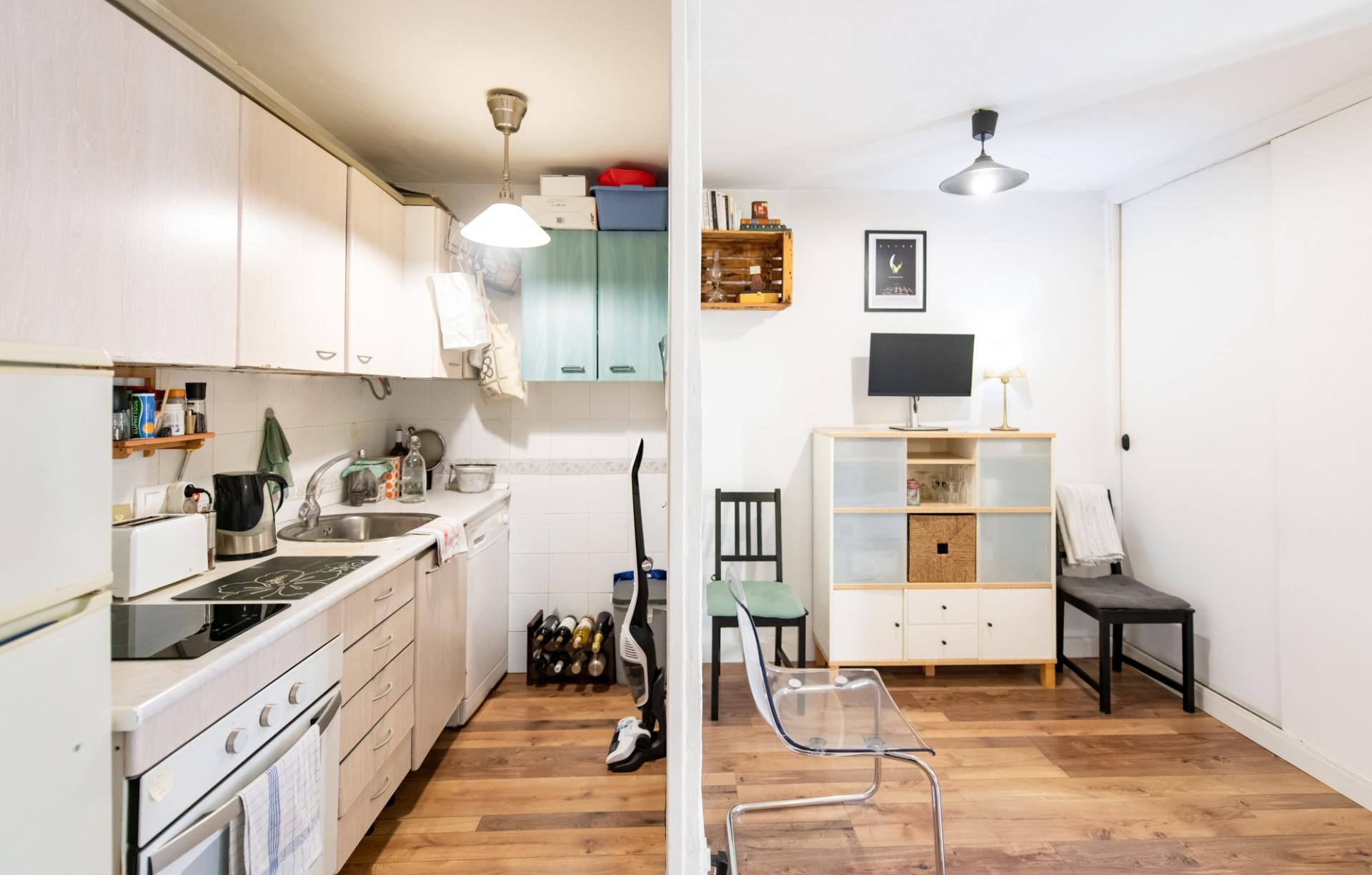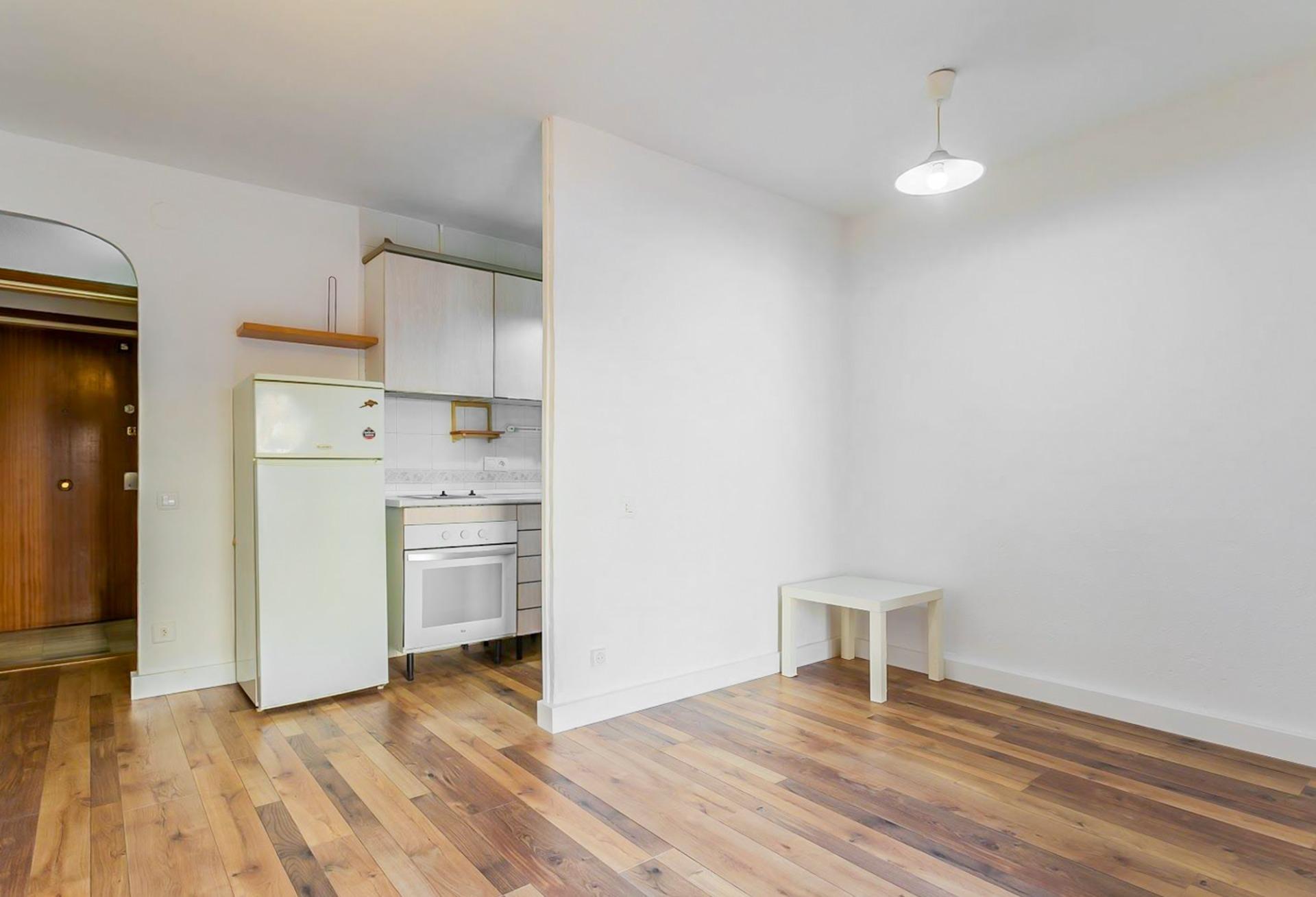 El pis s’organitza en un espai diàfan que integra la zona de cuina, sala d’estar i dormitori, creant un ambient còmode i ben aprofitat. Des d’aquesta estança s’accedeix a un petit balcó, que aporta llum natural i ventilació. L’habitatge es completa amb un bany amb dutxa en bon estat.