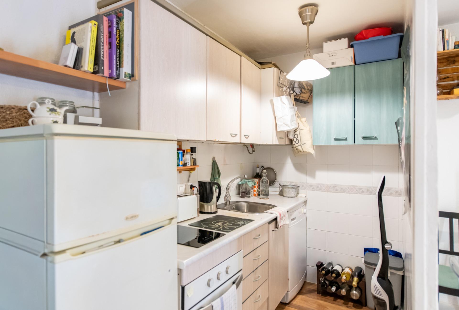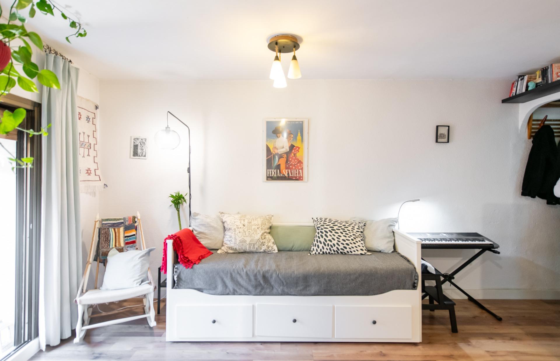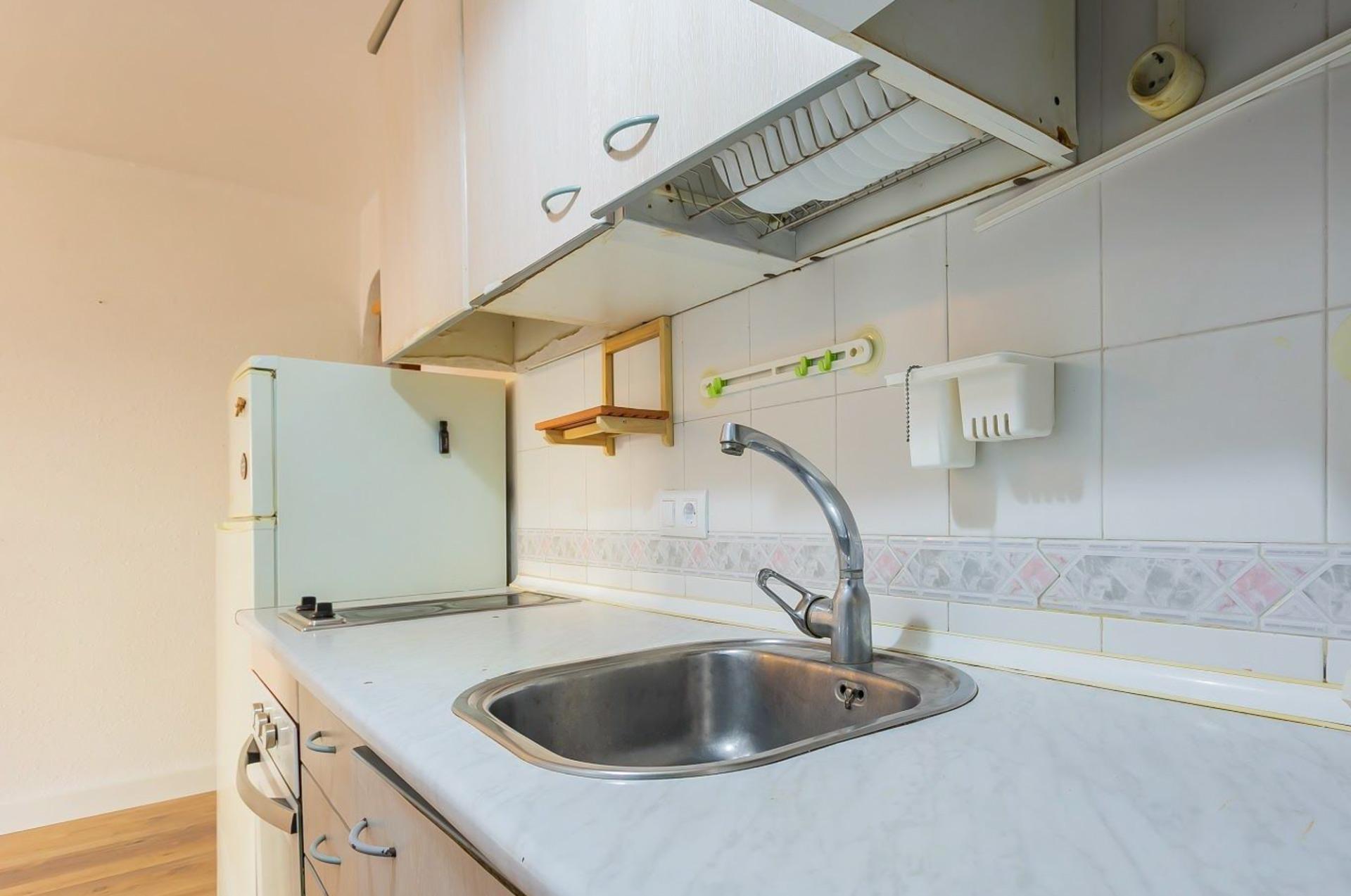 El pis s’organitza en un espai diàfan que integra la zona de cuina, sala d’estar i dormitori, creant un ambient còmode i ben aprofitat. Des d’aquesta estança s’accedeix a un petit balcó, que aporta llum natural i ventilació. L’habitatge es completa amb un bany amb dutxa en bon estat.